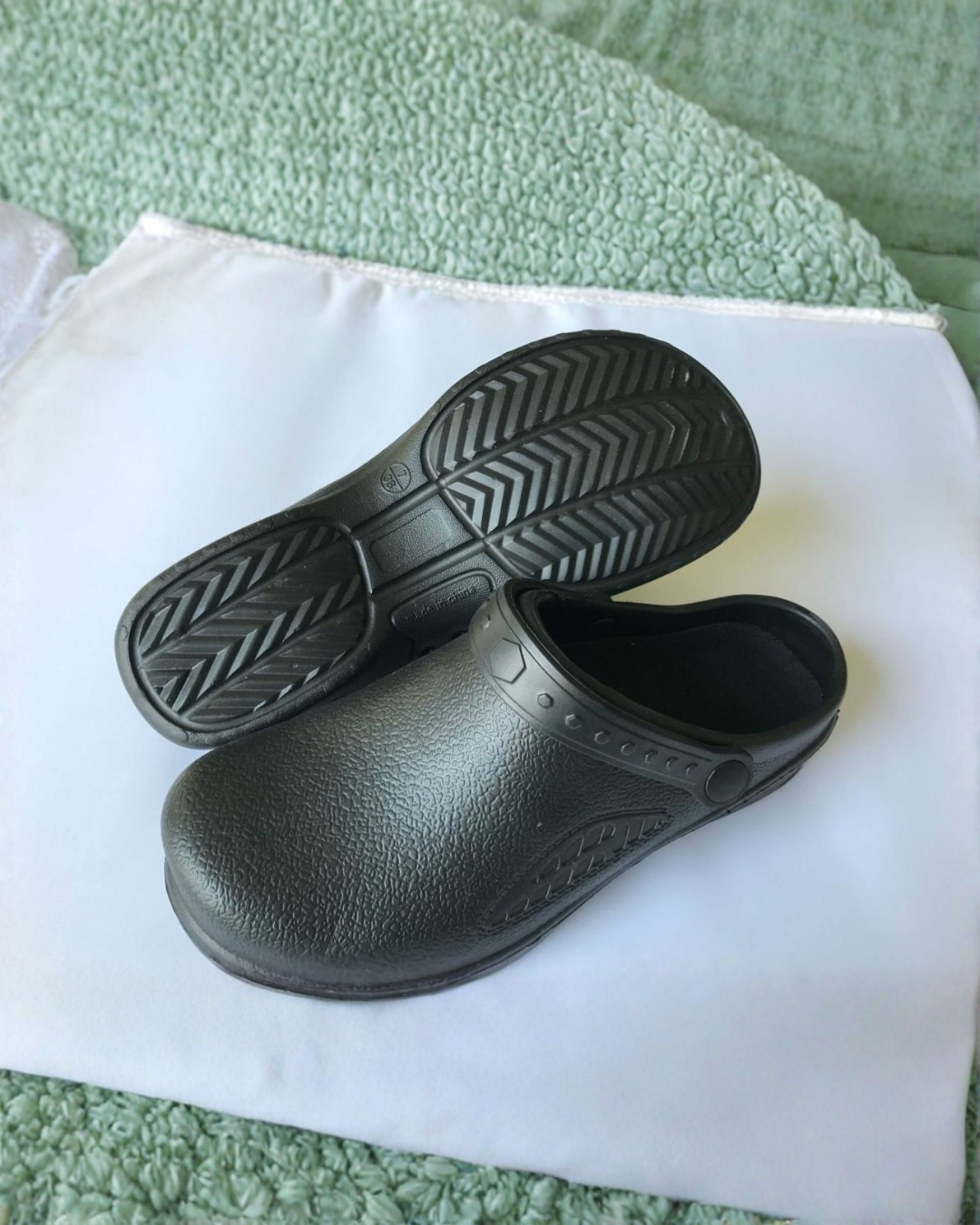 These black medical clogs are designed for healthcare professionals who need comfort, support, and durability throughout long shifts. Made from lightweight, easy-to-clean EVA material, they offer a cushioned footbed, slip-resistant sole, and breathable design. The closed-toe front and adjustable heel strap provide protection and a secure fit, making them ideal for clinical and hospital environments.