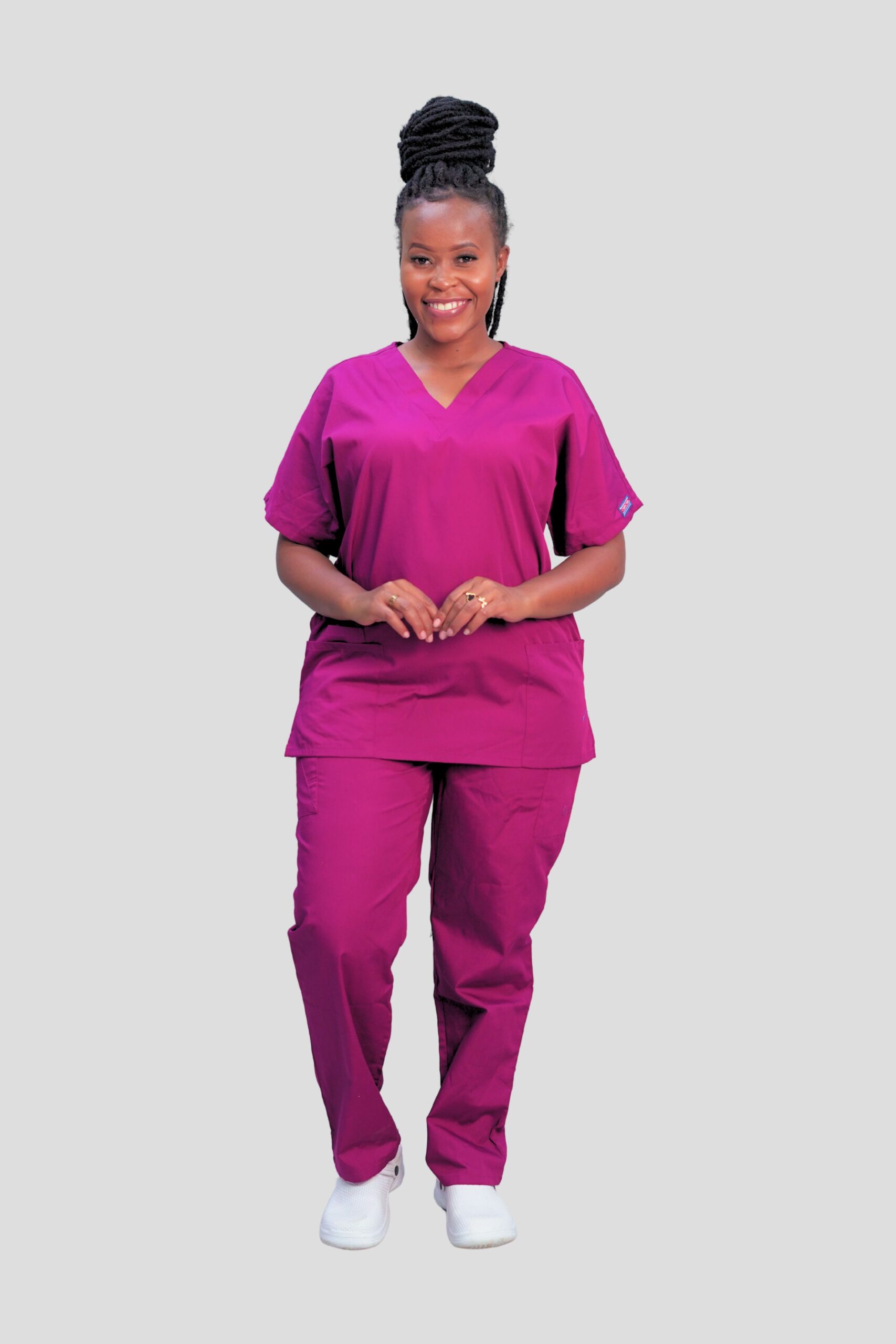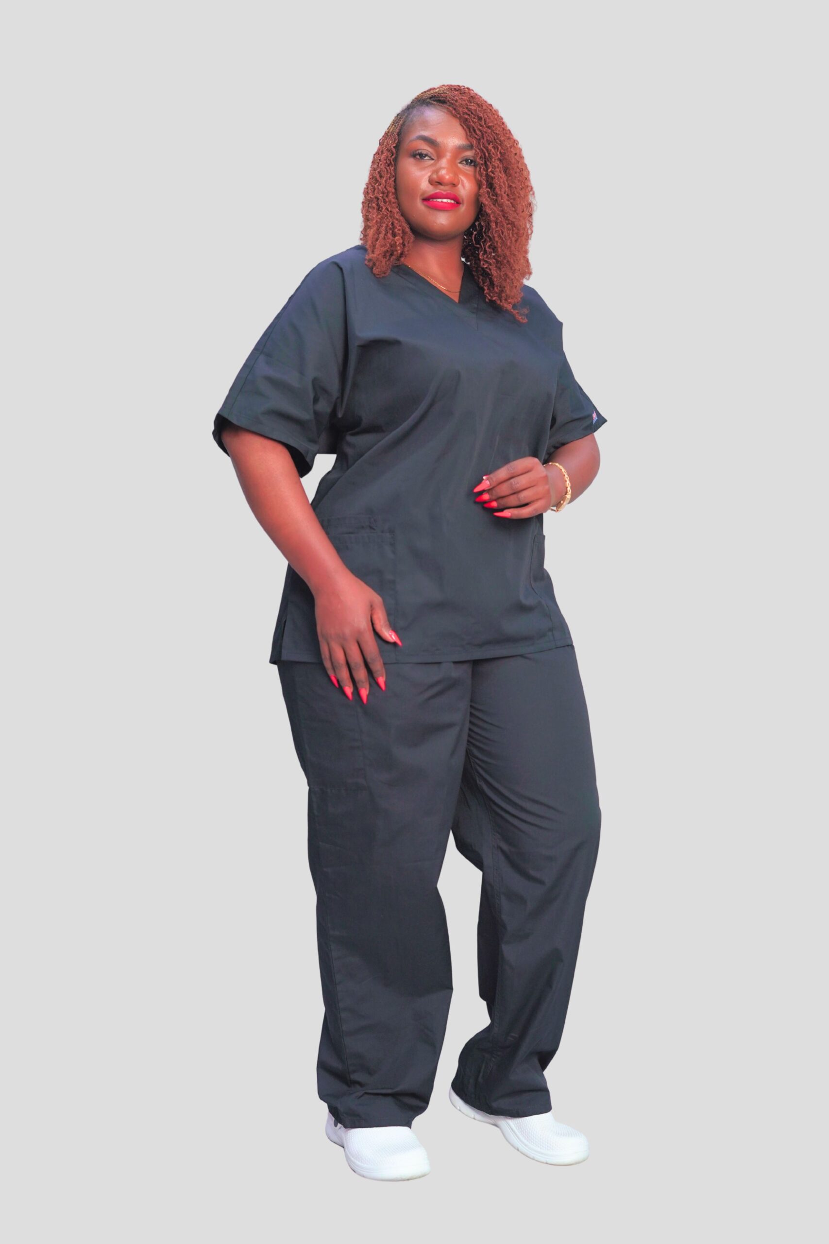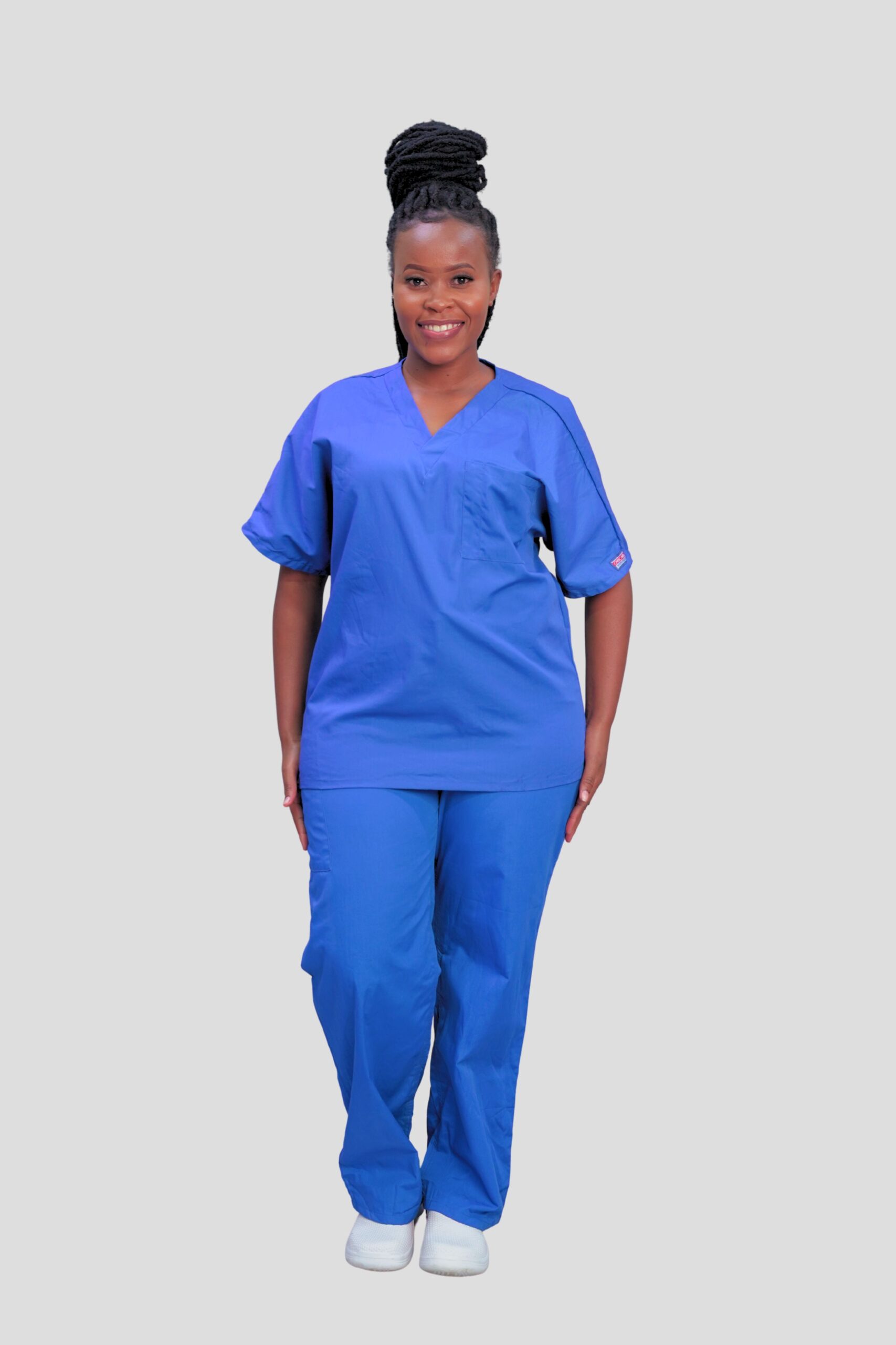 The set includes a tidy V-neck scrub top with instrument loops and practical pockets, paired with straight-leg or flare scrub pants featuring an elastic or drawstring waist. Designed for functionality and ease of wear, Cherokee Cotton-Blend scrubs suit a wide range of body types and work environments.